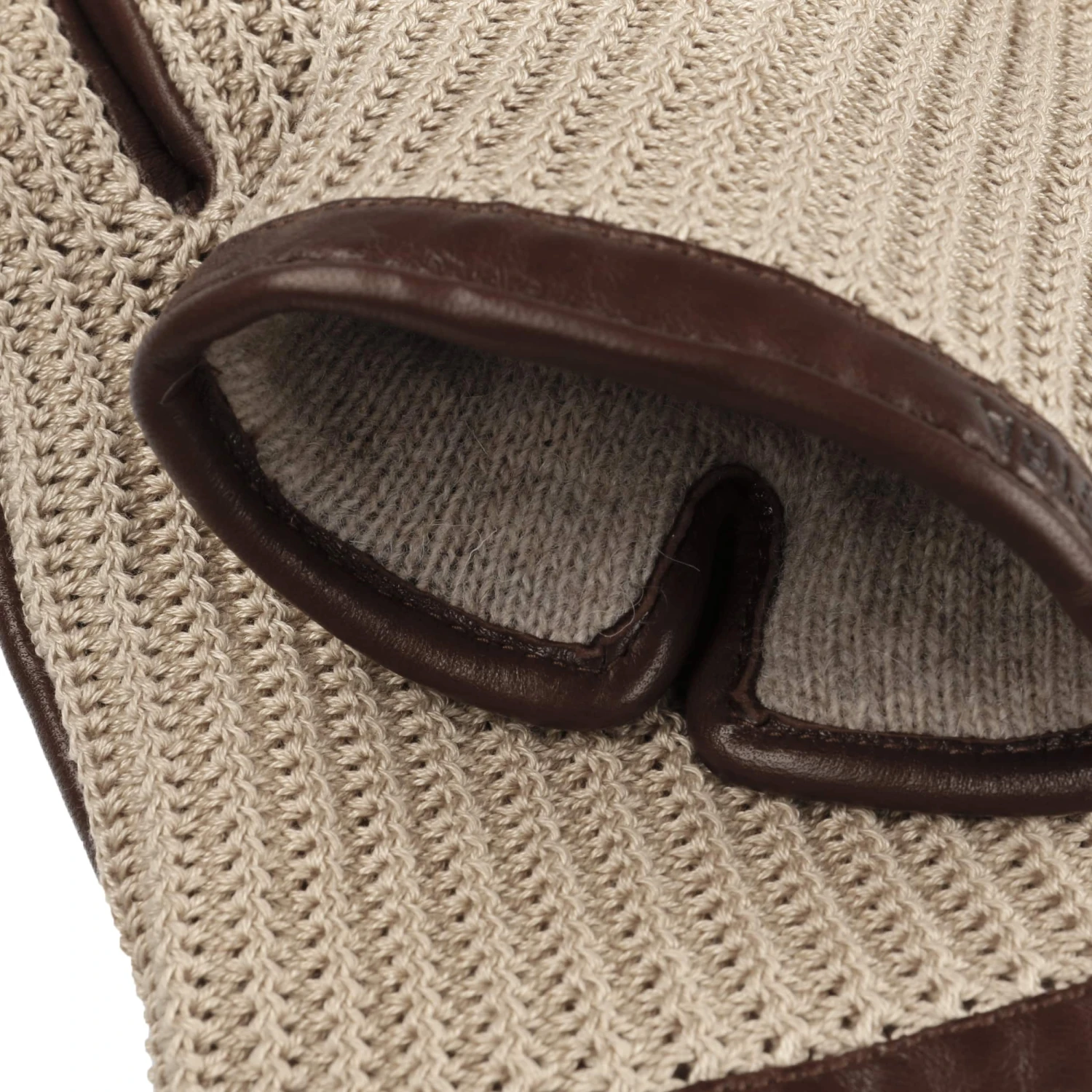 Die Handinnenfläche ist aus 100% feinstem Echtleder gefertigt und mit dezenten Ziernähten versehen. Der Handrücken wird von Baumwolle in luftiger Strickoptik bedeckt. Ein Futter mit einem hohen Wollanteil hält jeden einzelnen Finger auch an frostigen Tagen mollig warm. Der kurze Schaft schließt mit Leder ab.