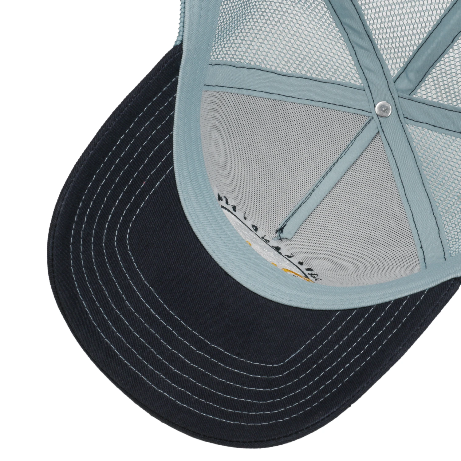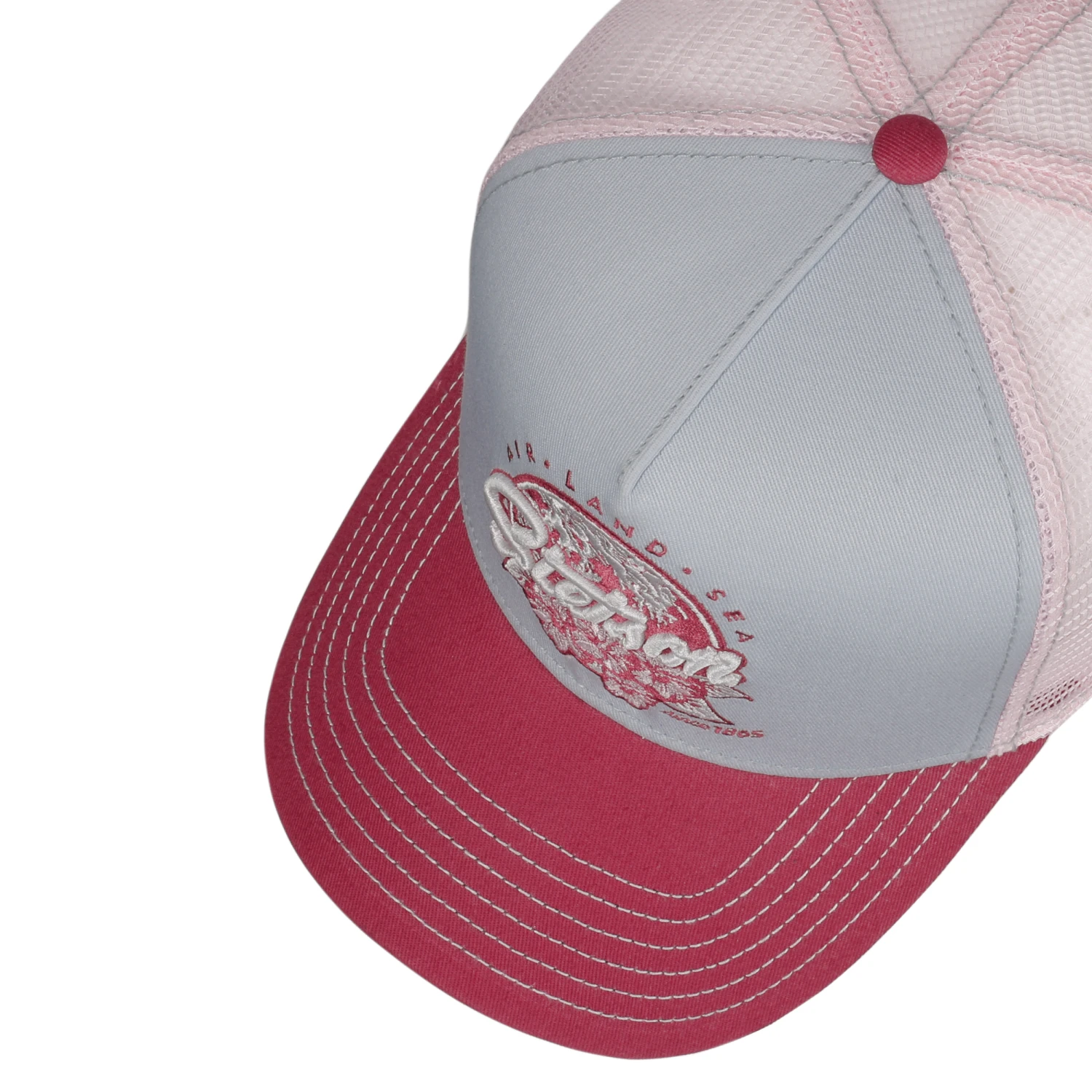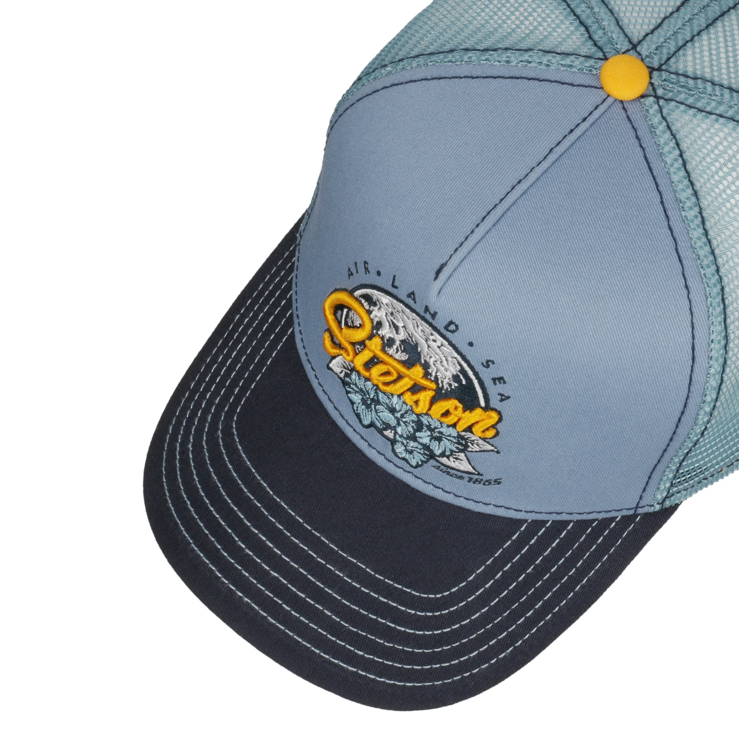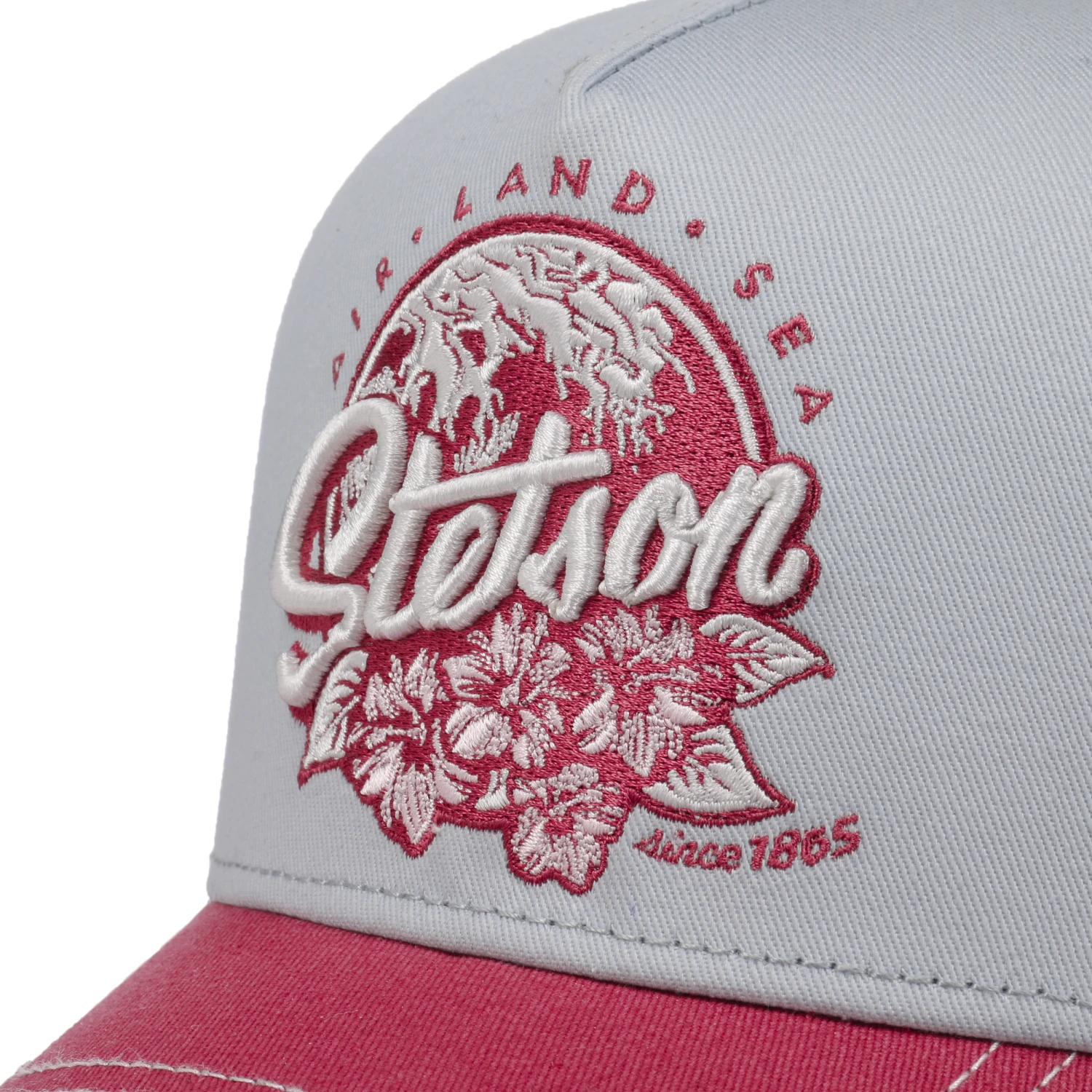 Maritime Farbtöne, aufwendig verzierte Blumendetails und ein auffälliger Markenschriftzug machen die größenverstellbare Basecap von Stetson zum angesagten Accessoire für warme Sommertage.