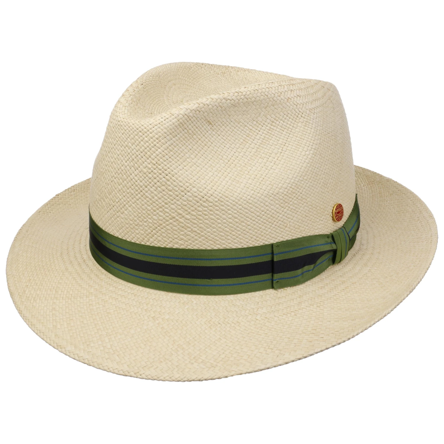 Dank seiner wasserabweisenden Oberfläche kann er auch bei einem plötzlich einsetzenden Regenschauer getragen werden. Der hochwertige Panamahut ist in der EU gefertigt und mit einem gestreiften Ripsband versehen, das sich kontrastreich vom hellen Stroh abhebt.