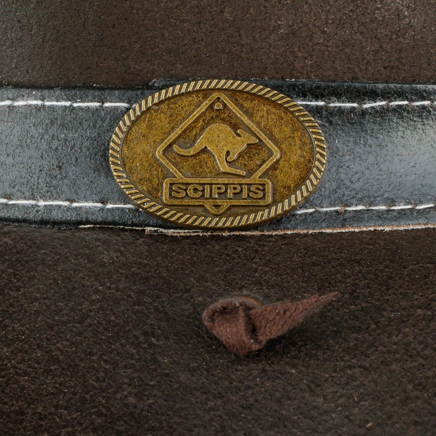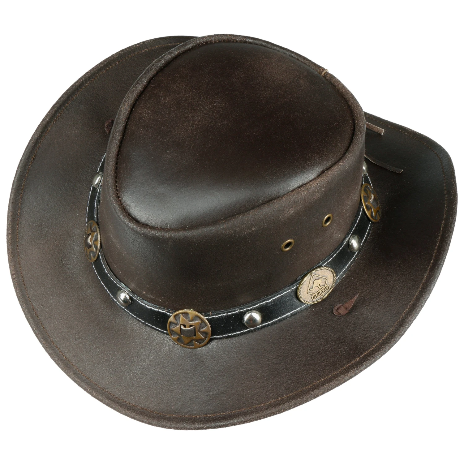 Sternförmige Conchos und silbrige Nieten zeigen, wie abenteuerlustig der flache Rindslederhut von Scippis ist.