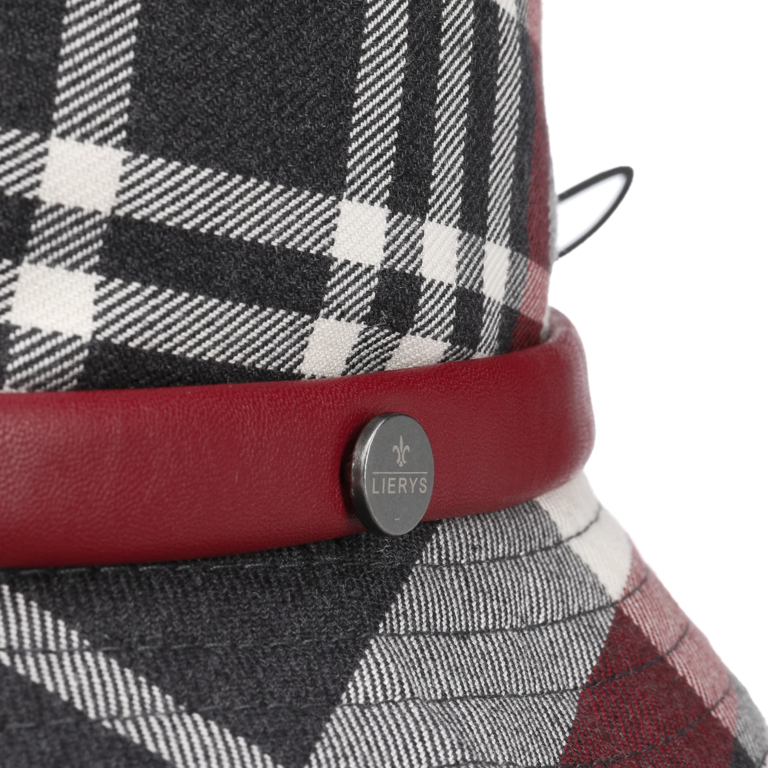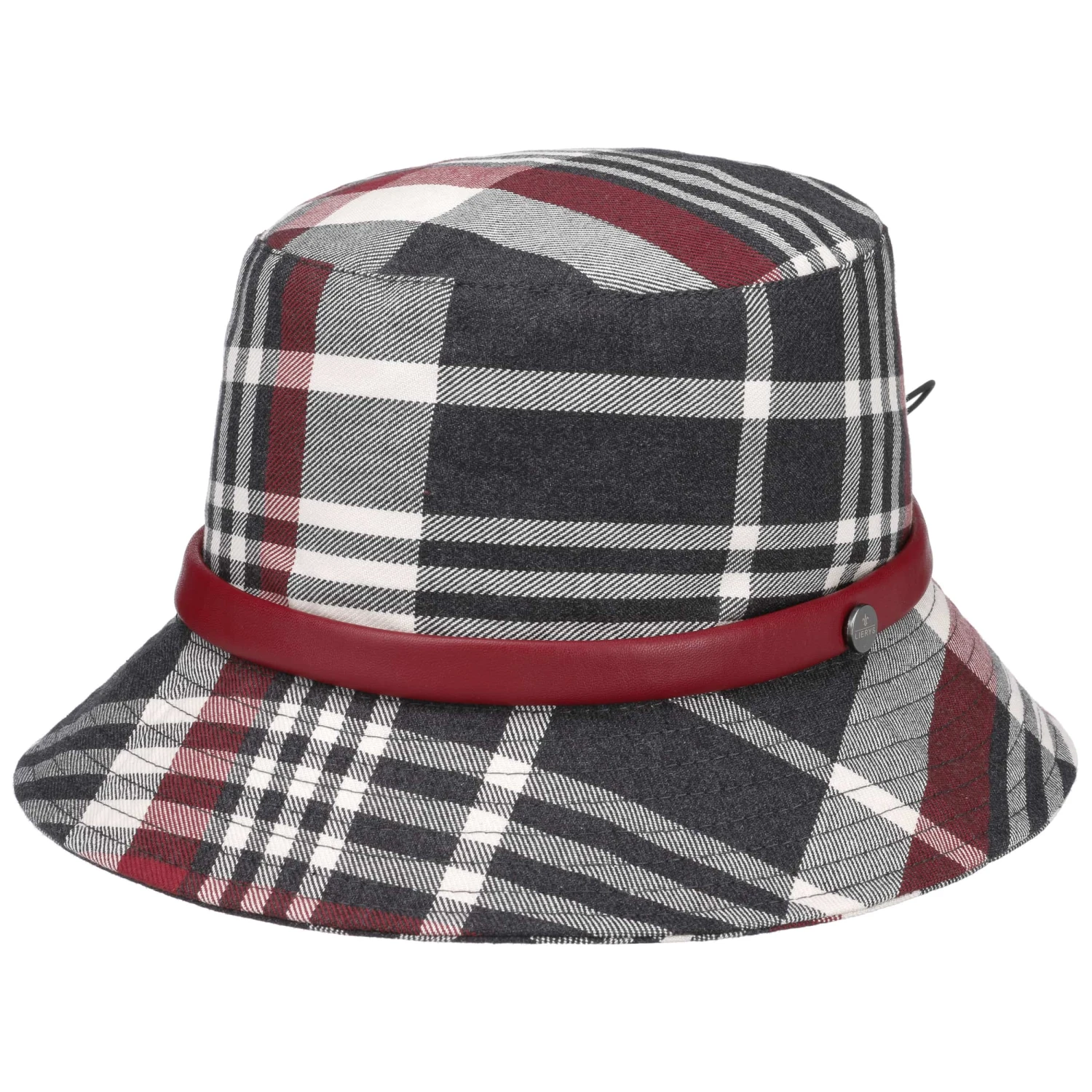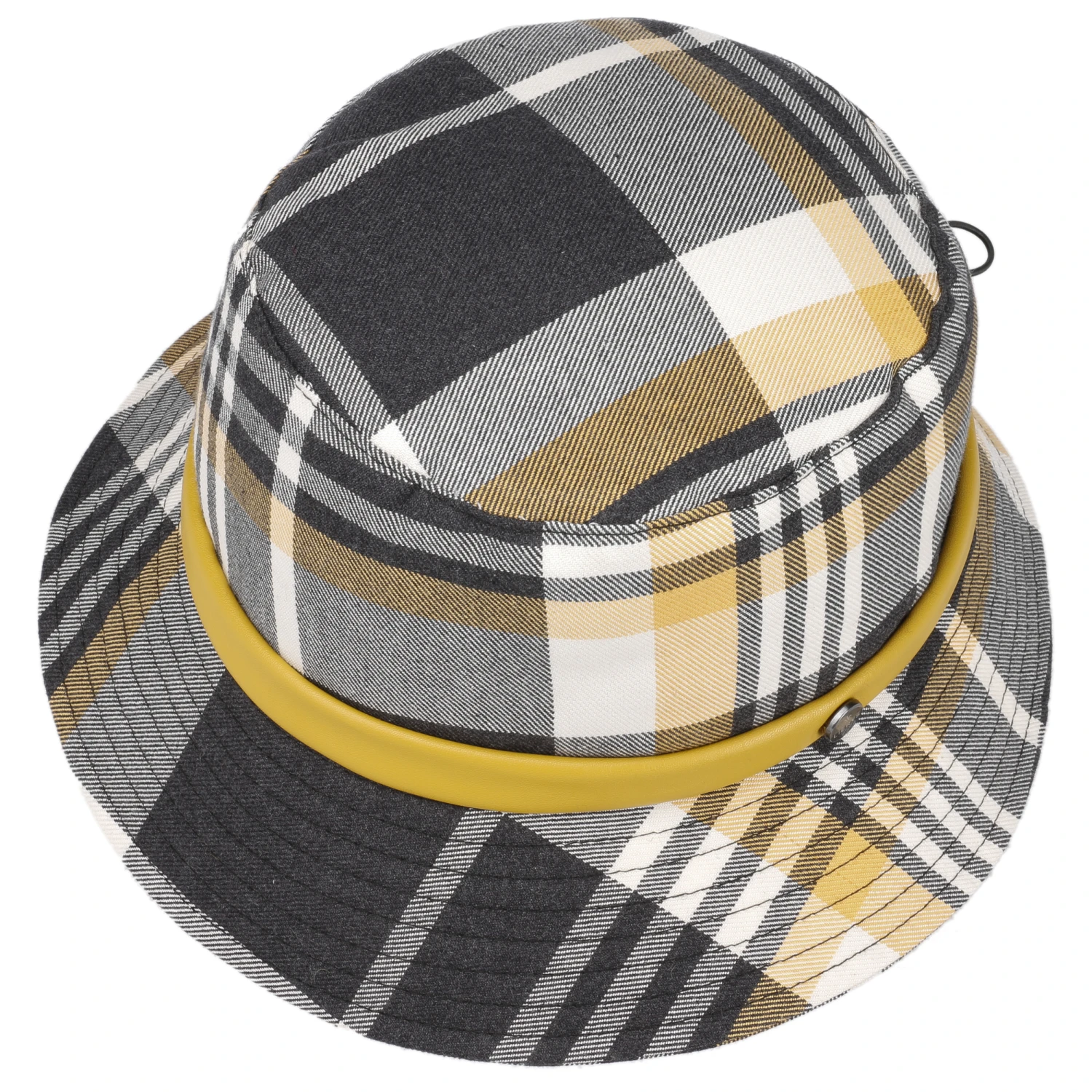 Zu dem gemütlich modischen, von Streifen durchzogenen Karodesign des baumwollenen Fischerhuts von Lierys gesellt sich eine elegante schmale Garnitur aus Kunstleder.