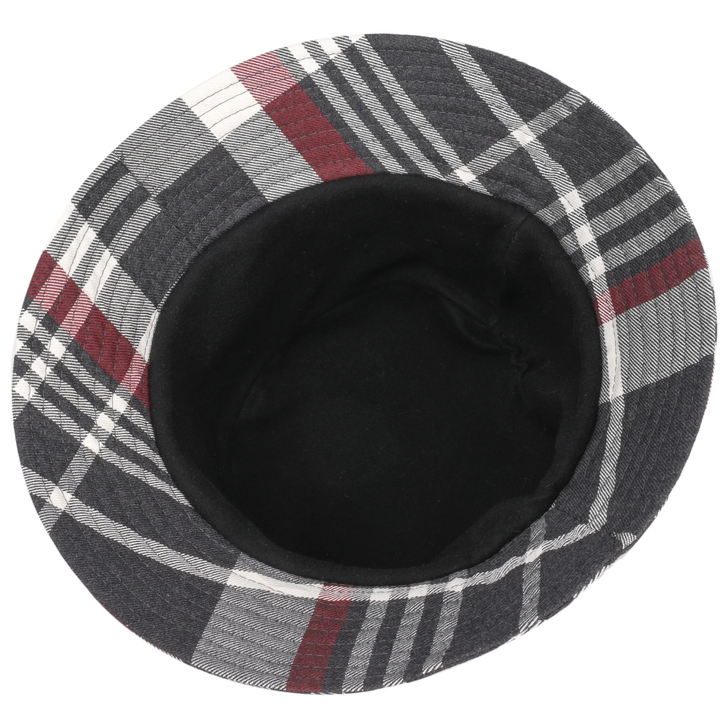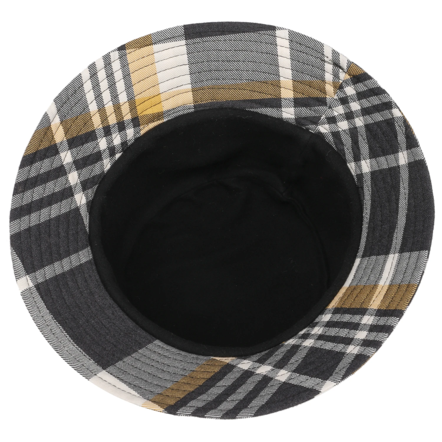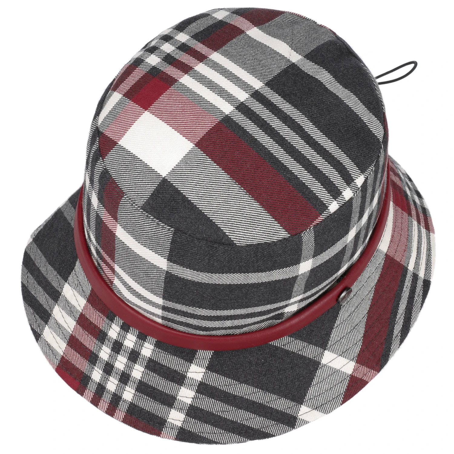 Zu dem gemütlich modischen, von Streifen durchzogenen Karodesign des baumwollenen Fischerhuts von Lierys gesellt sich eine elegante schmale Garnitur aus Kunstleder.