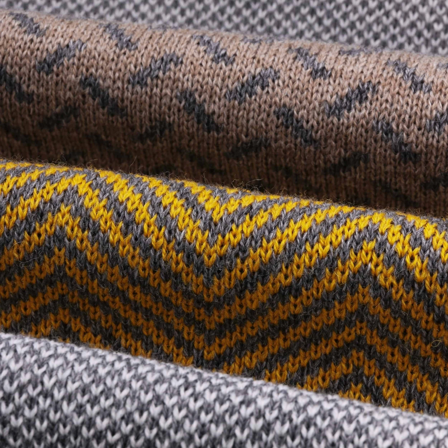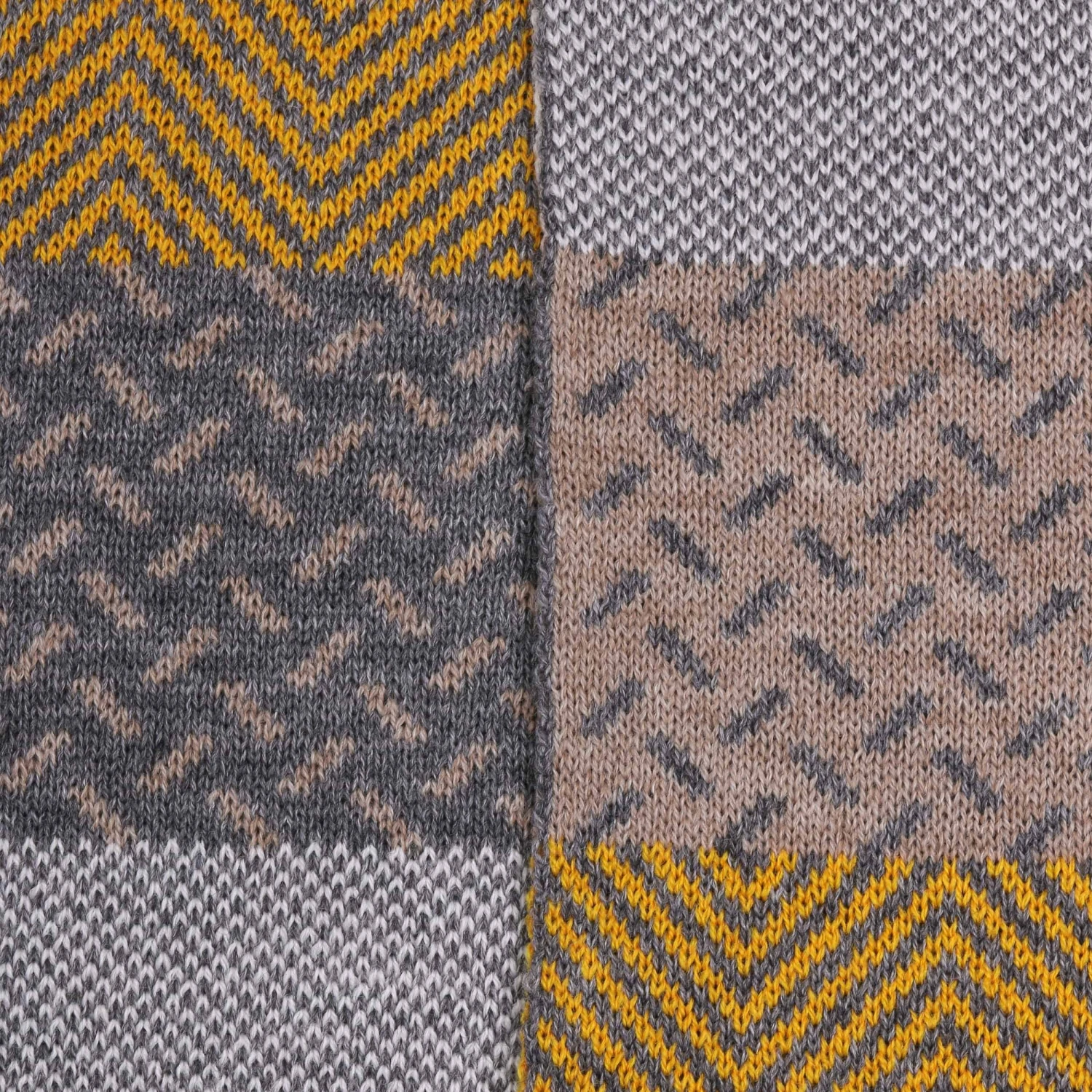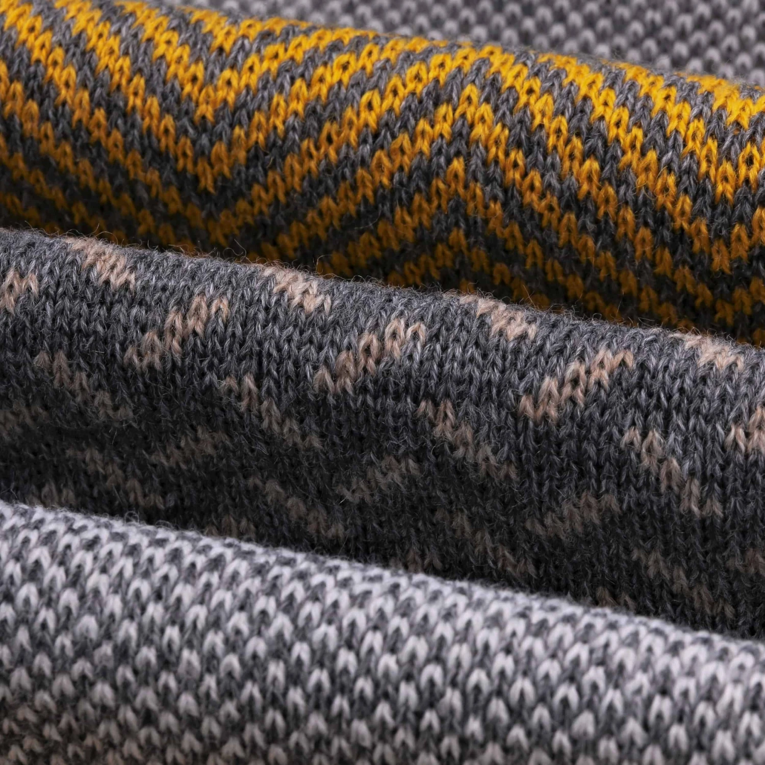 An beiden Enden wartet der Lierys-Strickschal mit filigranem, unifarbenem Rand auf, um sich darüber in geschmackvoll abwechslungsreichem Muster fortzusetzen – unterteilt in breite Streifen.