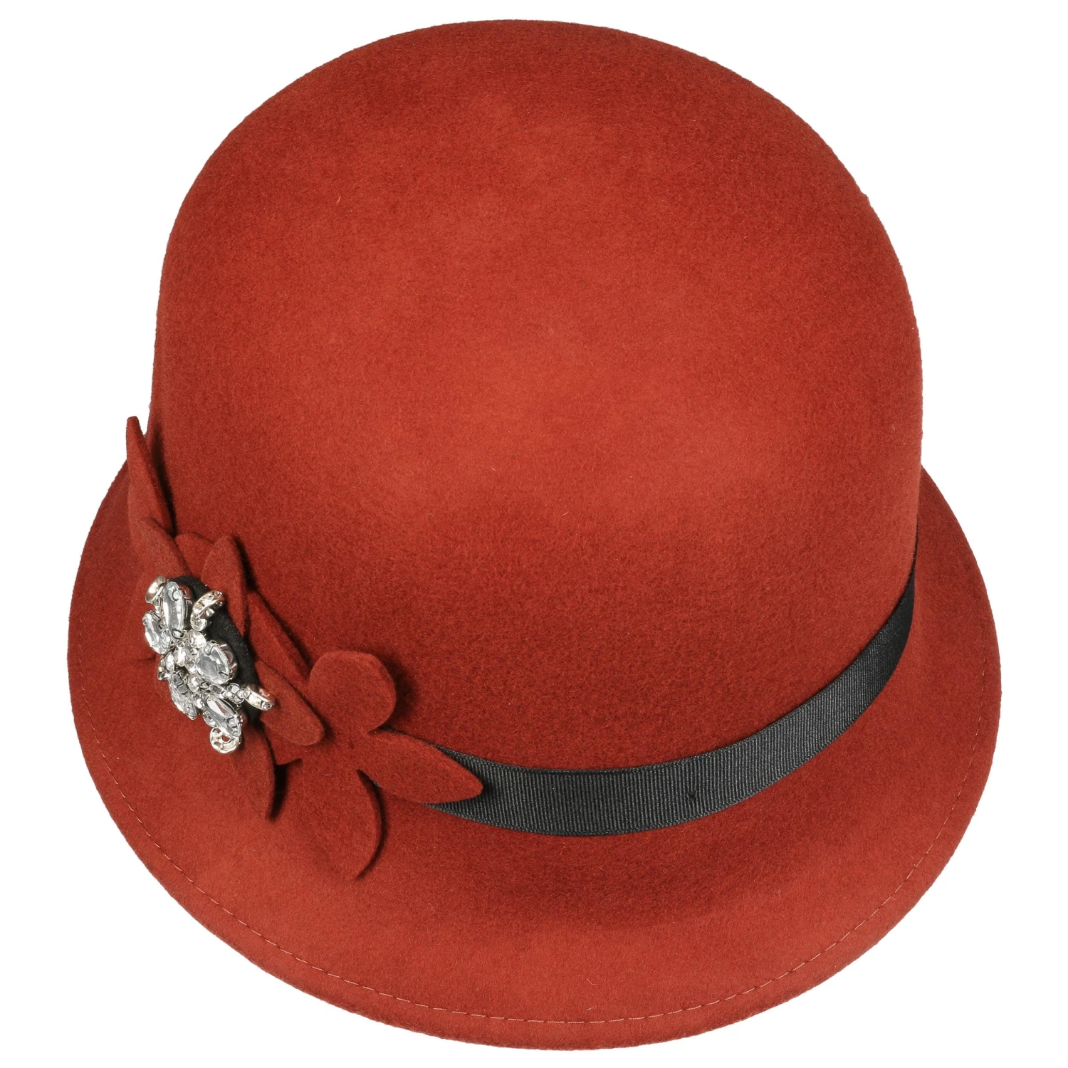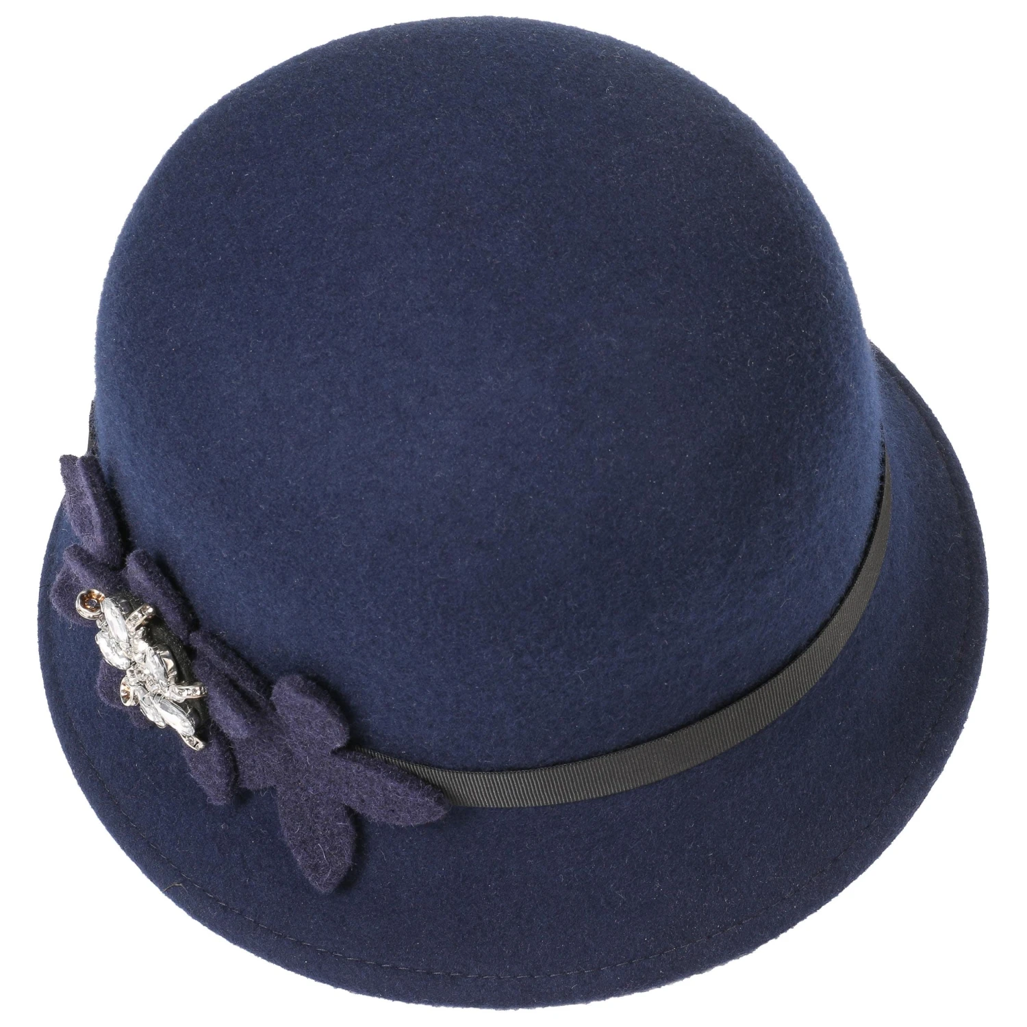 Die reizvolle Optik der aus 100% wärmendem Wollfilz gefertigten Kopfbedeckung ist von liebevoll ausgearbeiteten Details geprägt. Auf dem farblich dezent abgesetzten Ripsband sitzen drei große Blüten aus Filz, die wiederum von einer großen Applikation aus zahlreichen intensiv schimmernden Steinchen besetzt sind.
