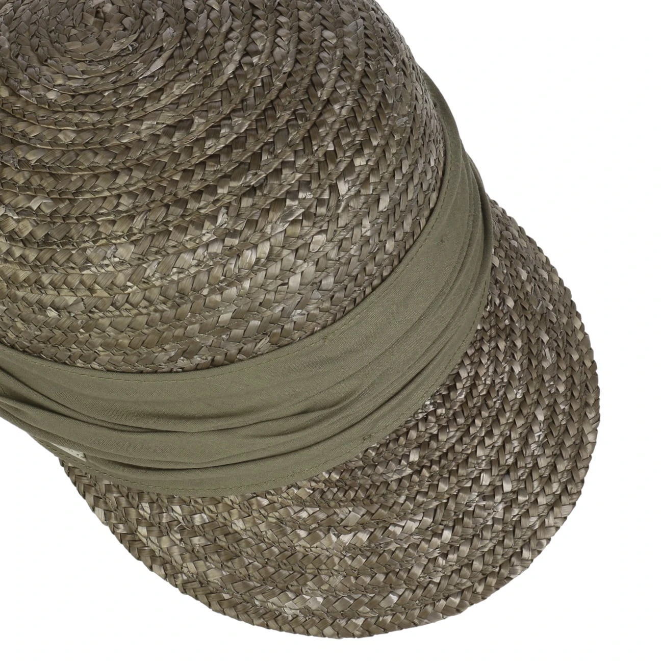 Die komfortable Damencap mit dem großzügigen Schirm ist aus ultraleichten Naturstrohborten in flexibler Qualität gefertigt und verwöhnt ihre Trägerin mit einem wohltuenden Schatten auf der Nasenspitze. Die breite, dekorativ gefaltete Stoffbandgarnitur schenkt der modischen Strohkappe einen sichtlich eleganten Feinschliff. Die optimale Schirmmütze für Golfplatz, Kreuzfahrt oder Strandpromenade.