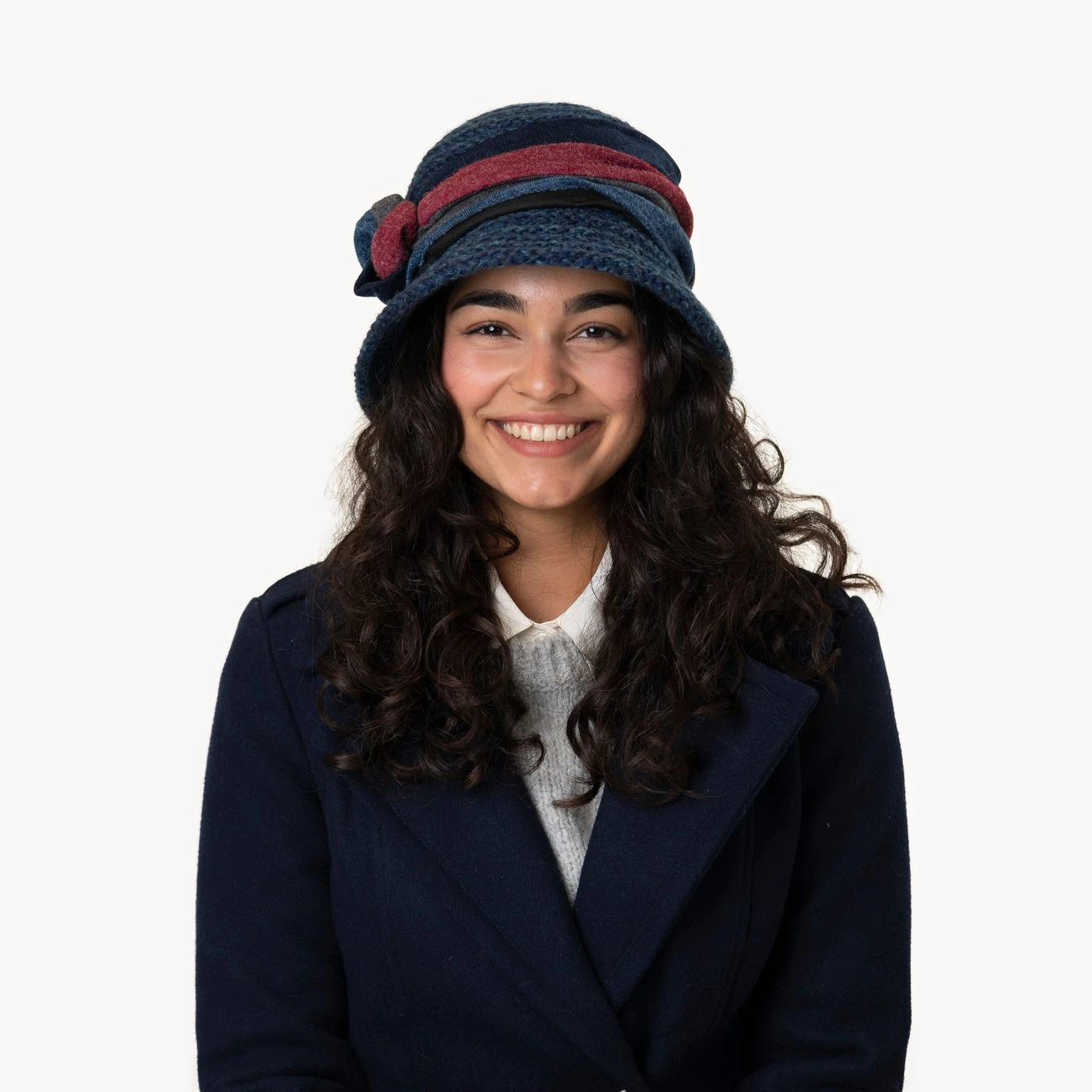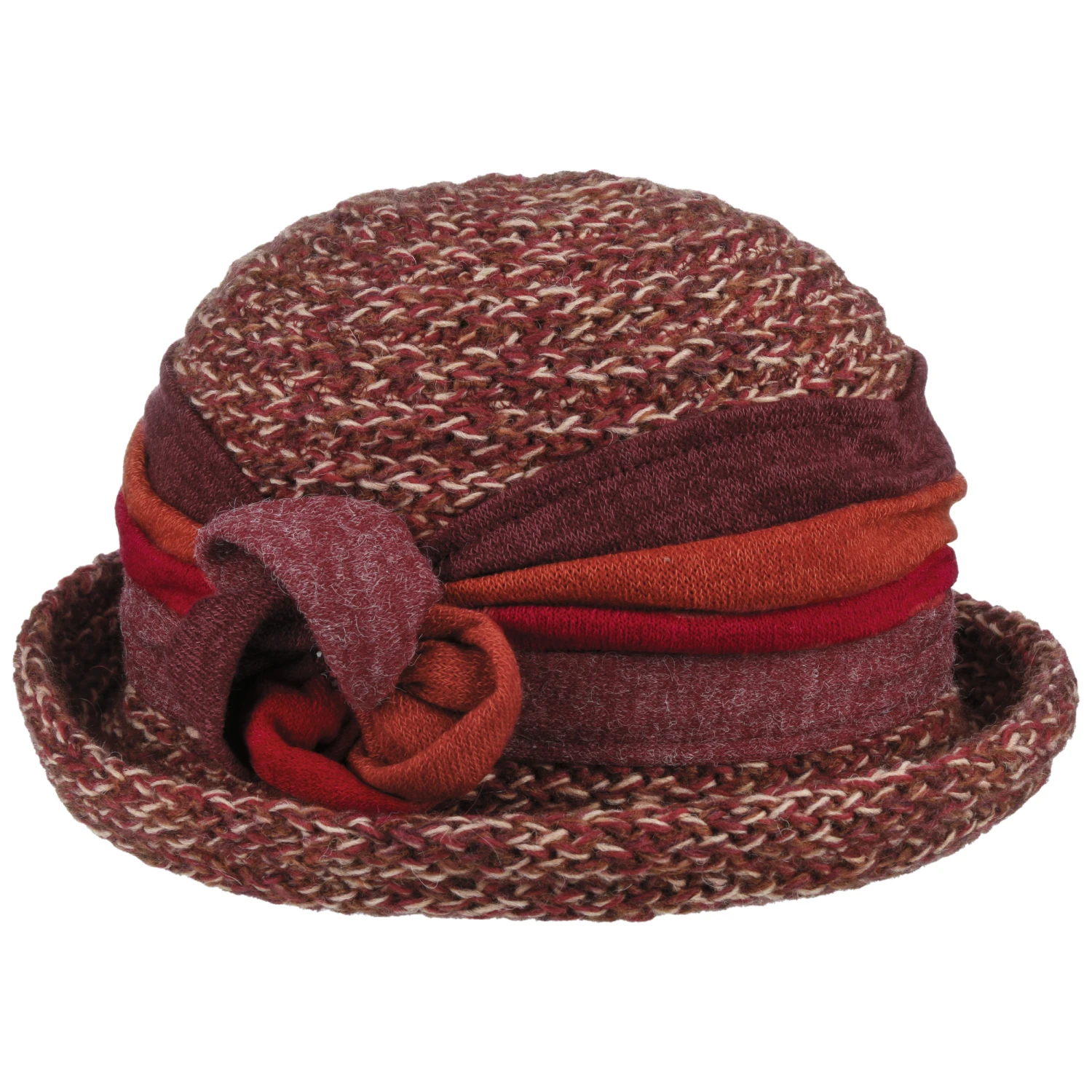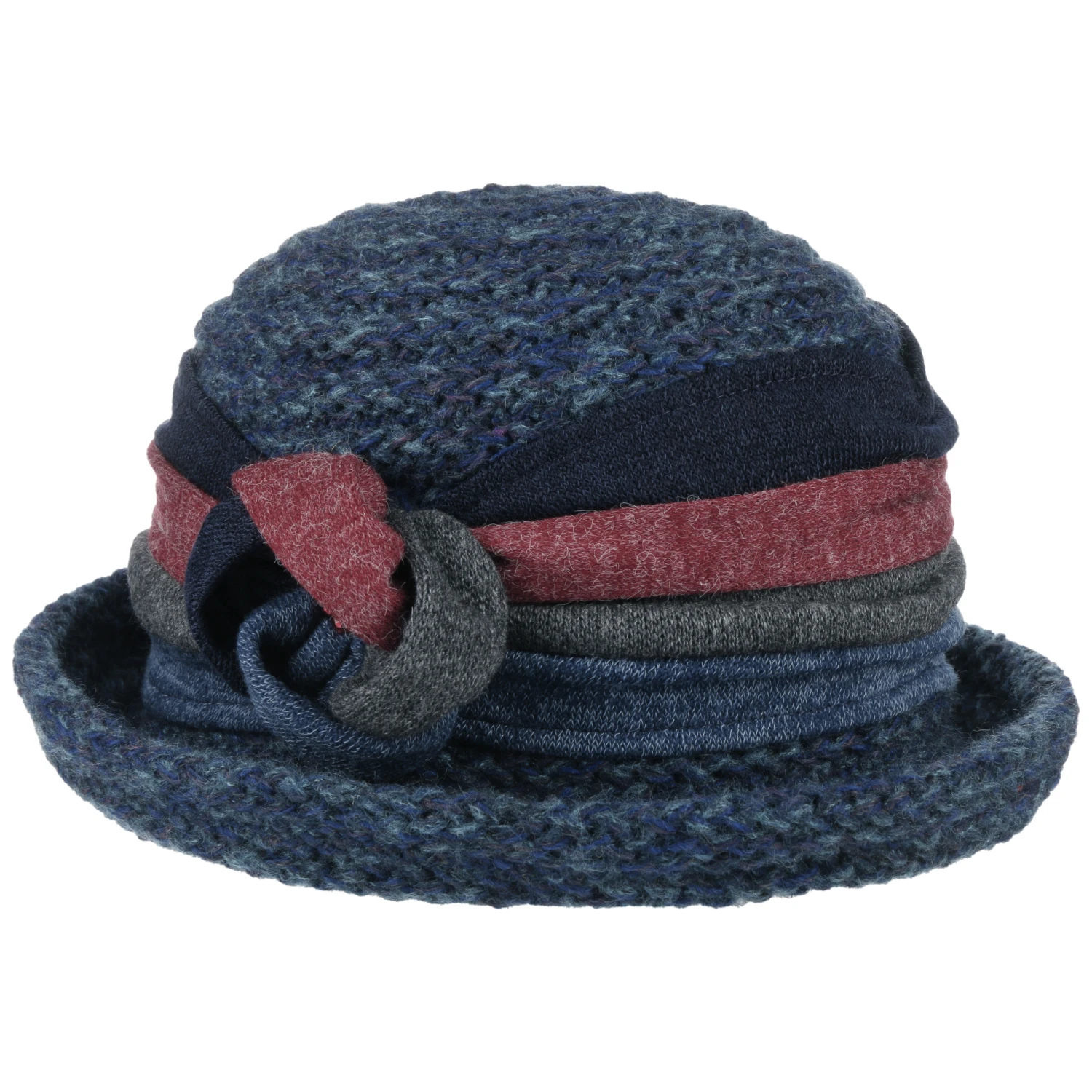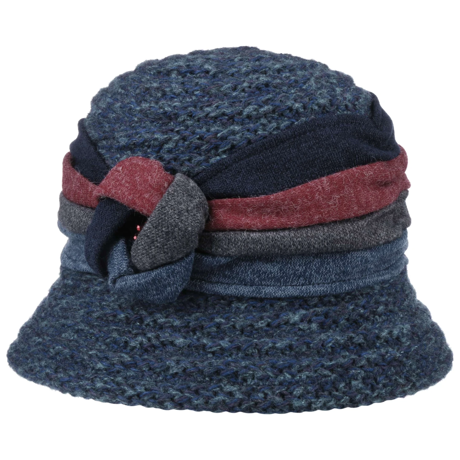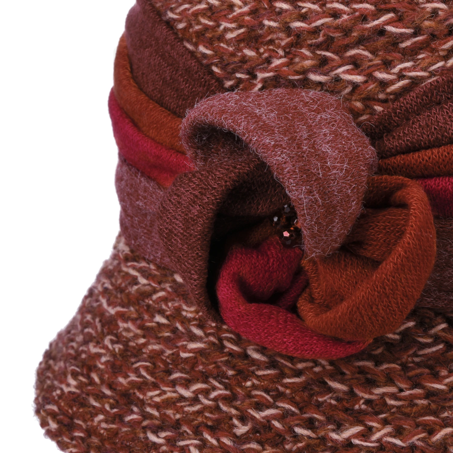 Die melierte Farbgebung und der umgeschlagene Rand verleihen dem Glockenhut eine gemütliche Ausstrahlung, betont durch das mehrfarbig gestreifte Garniturband, das vorn zu einem blumenförmigen Knoten gebunden ist. Wolle, Mohair und Alpakawolle im Materialmix spenden angenehme Wärme.