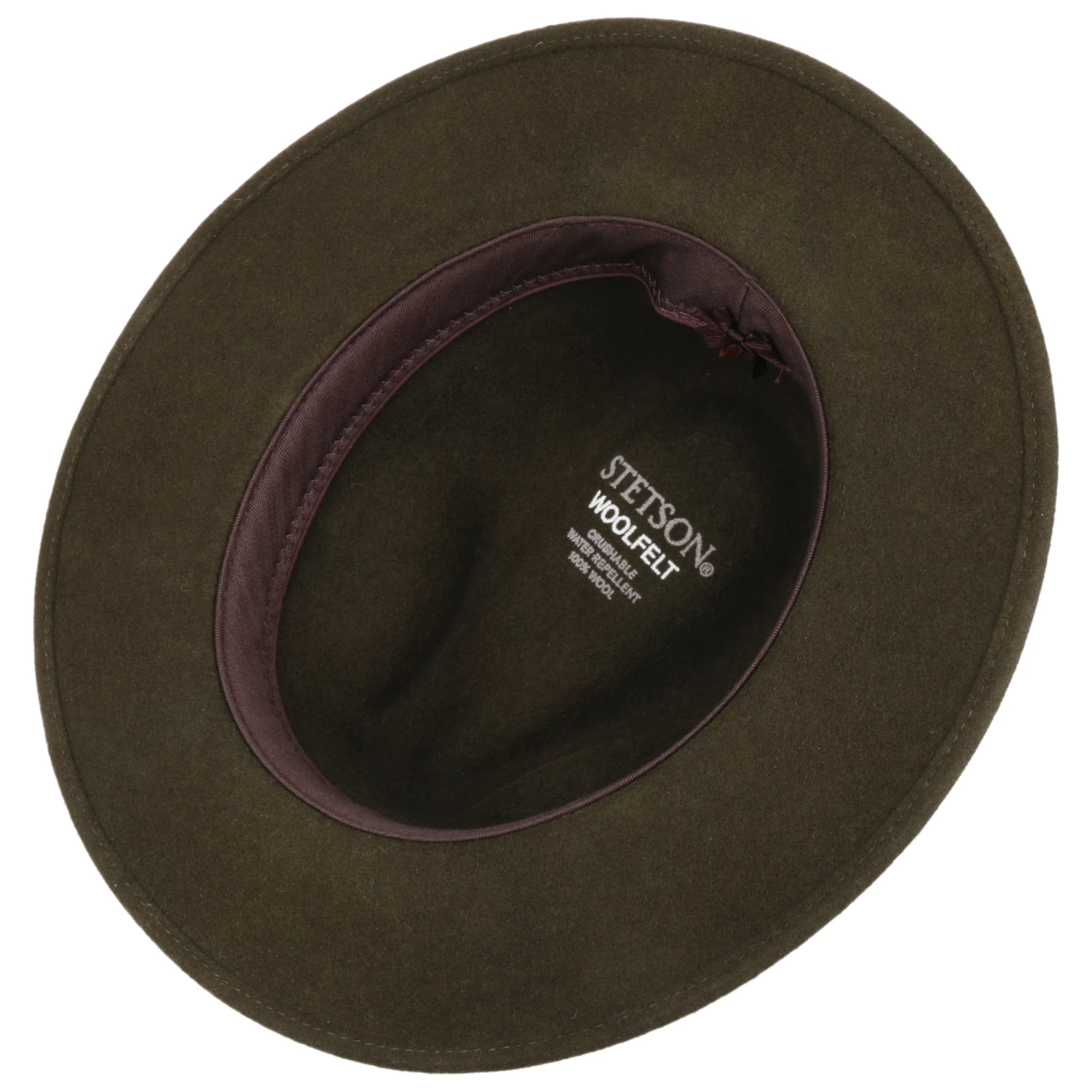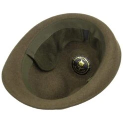 Der wasserabweisende Hut ist aus 100% Wollfilz gefertigt und lässt Regentropfen einfach abperlen. Die recht breite Krempe des knautschbaren Filzhutes schützt Gesicht und Nacken vor der Sonne. Am schmalen Ledergarniturband steckt eine mehrfarbige Feder.