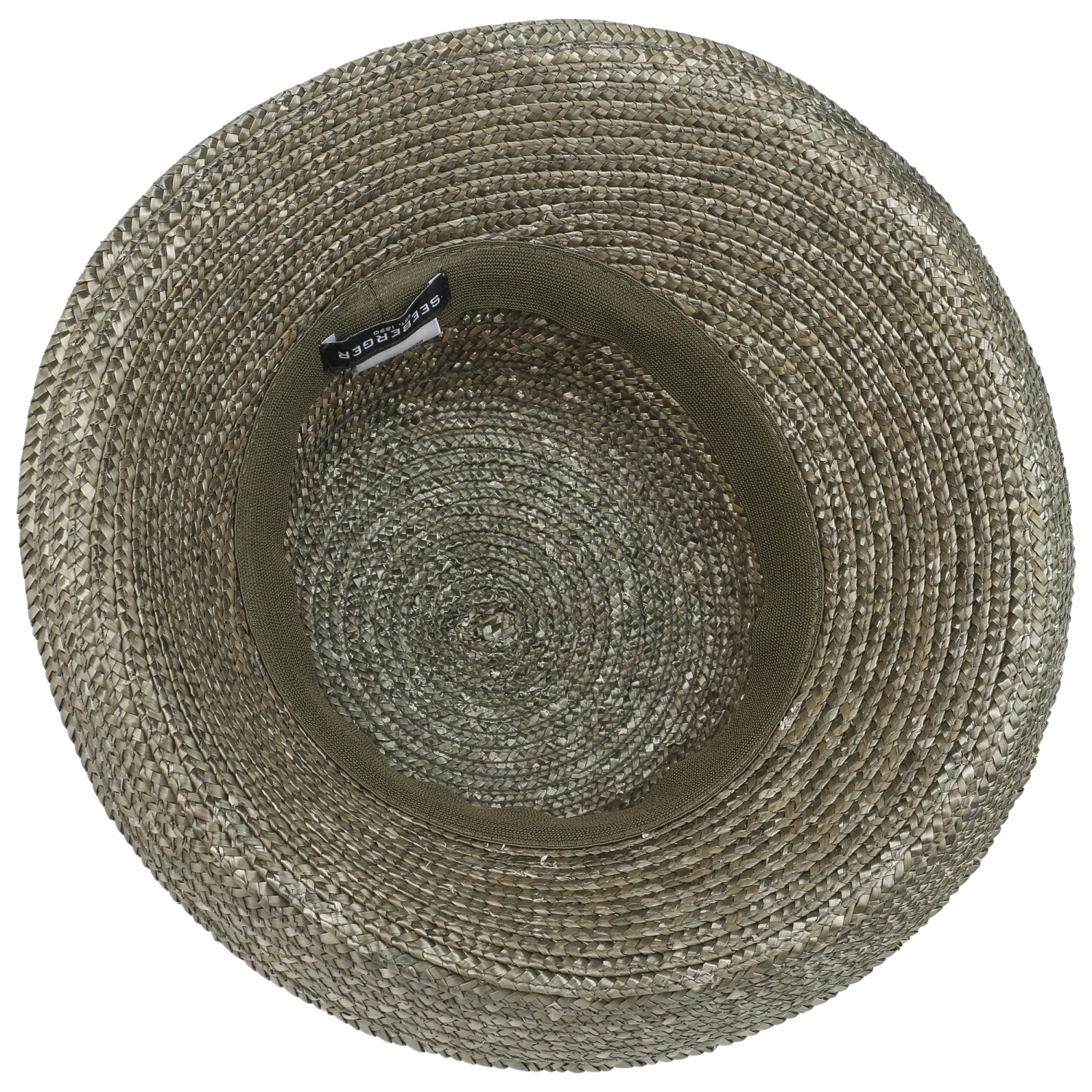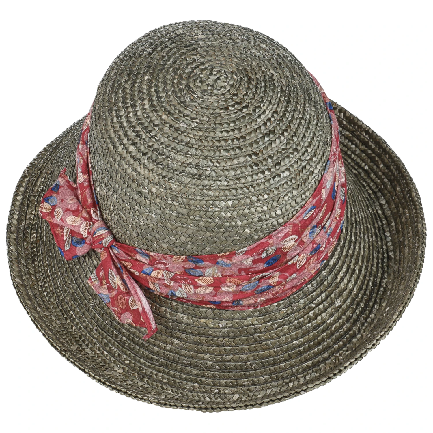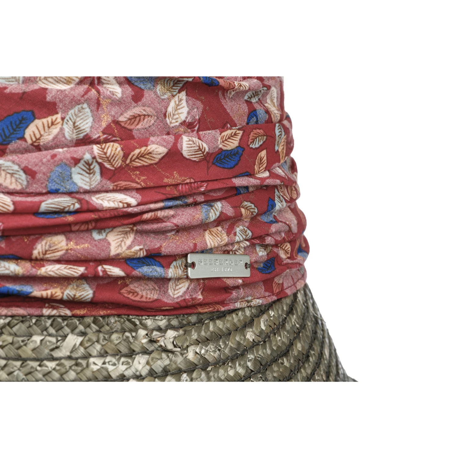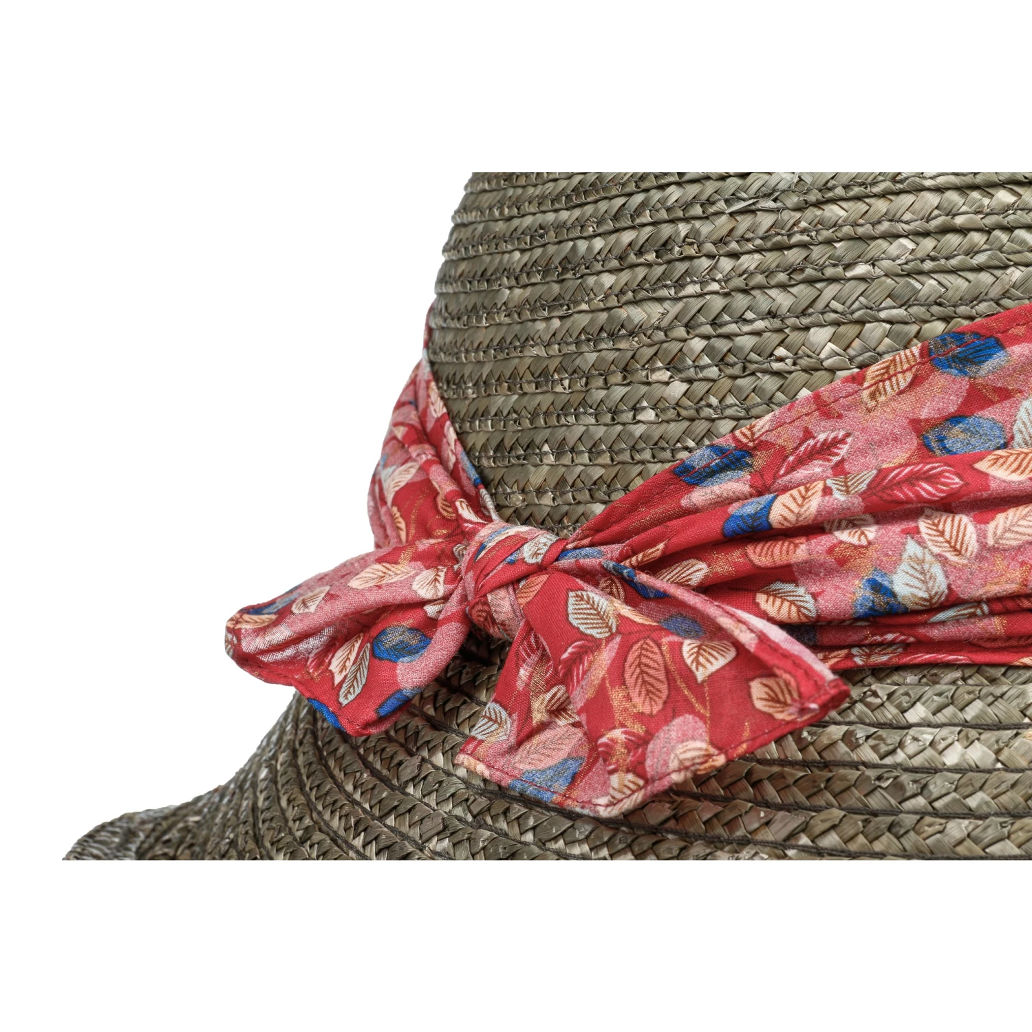 Ein Stretchfutterband vollendet den Tragekomfort. Die asymmetrisch aufgestellte Krempe verleiht dem Strohhut zusammen mit der breiten, schräg um die Krone verlaufenden und in einer Schleife endenden farbig gemusterten Garnitur anmutigen Charme, der der Dame auf Reisen und in der heimischen Freizeit schmeichelhaft zu Gesicht steht.