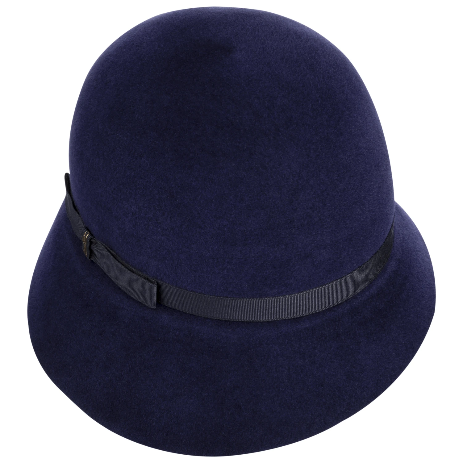 Neben ihrer schönen Form – mit dem für Glockenhüte typischen runden Kopf und der nach unten geneigten Krempe – ist es das qualitativ hochwertige Material aus sorgfältig verarbeitetem Haarfilz, das hier Aufmerksamkeit erregt. Ein delikat anmutendes Ripsband mit metallisch schimmernder Logo-Stickerei rundet das adrette Design ab.