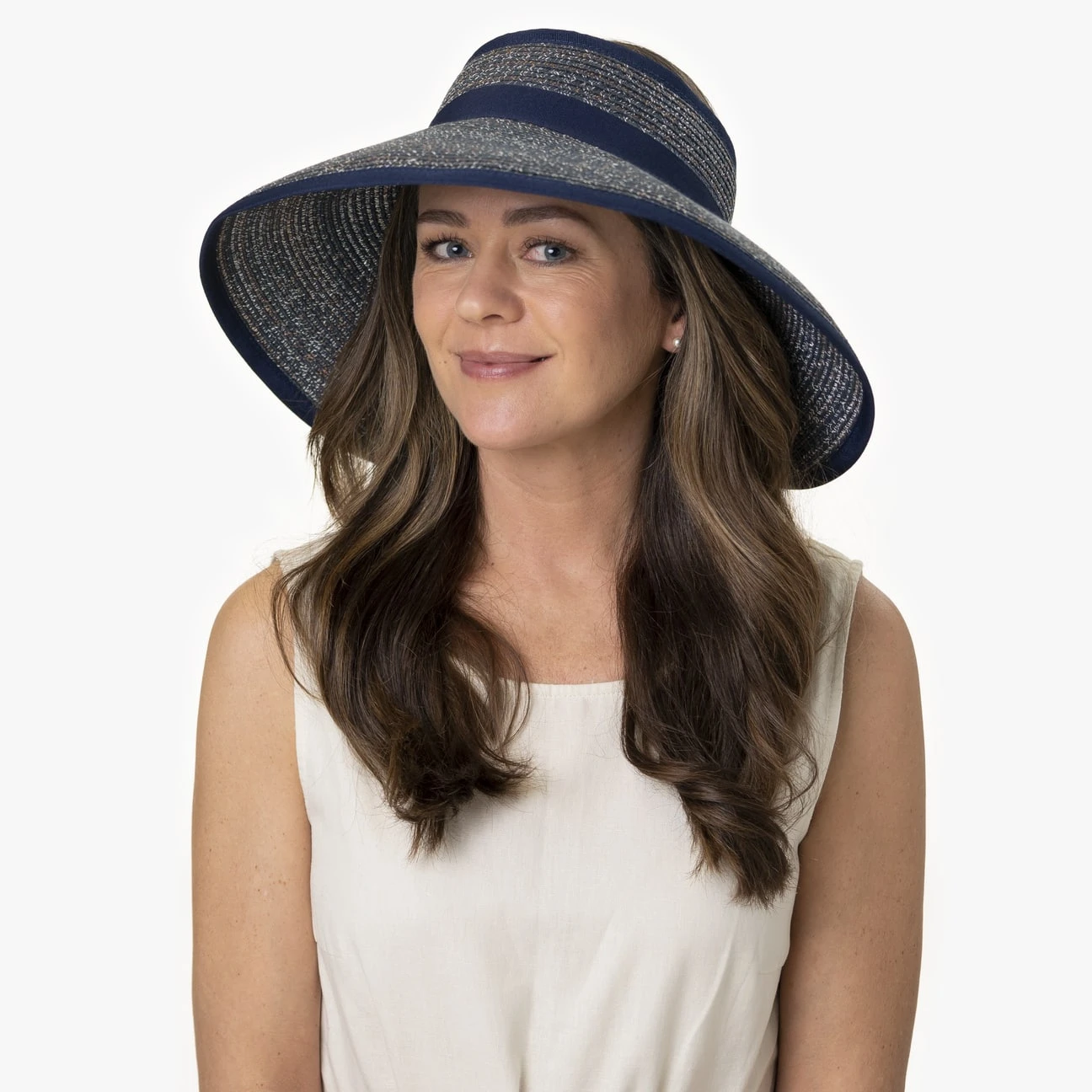 Der Materialmix mit Papierstroh macht diesen ausladenden Visor leicht und angenehm zu tragen.