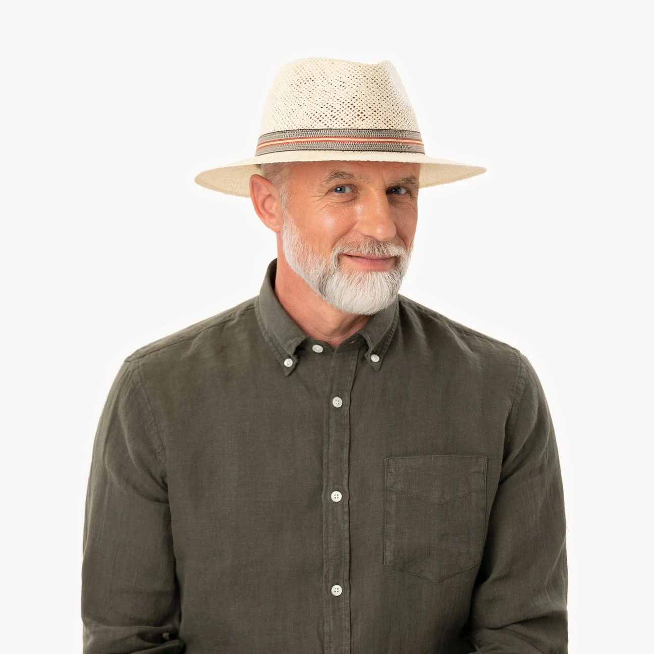Seine breite Krempe spendet Gesicht und Nacken viel Schatten. Der zurückhaltend einfarbige Look des Materials wird von einem Garniturband unterbrochen, das mit mehrfarbigen Streifen die Blicke auf sich zieht.