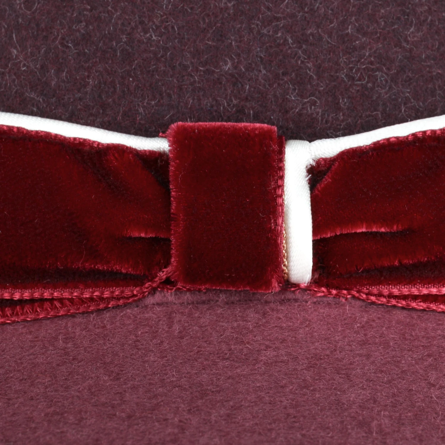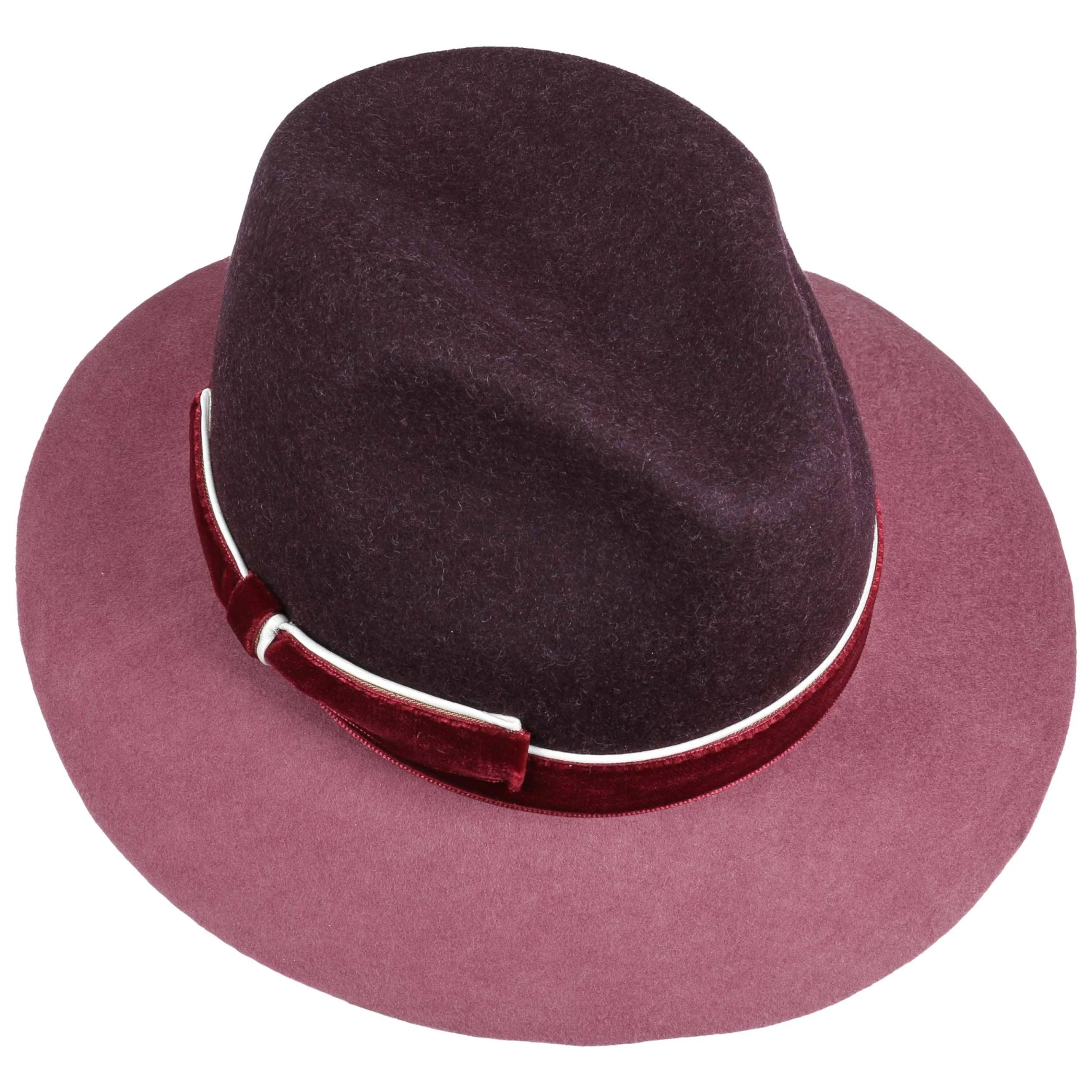 Die edlen Oberflächenstrukturen von weichem Samt und feinem Wollfilz setzen sich hier kraftvoll von einander ab, wirken in Ihrer Kombination aber gleichzeitig attraktiv und harmonisch. Aufeinander abgestimmte Farbtöne unterstreichen den ausgeglichenen Charme, den der elegante Bogarthut ausstrahlt.