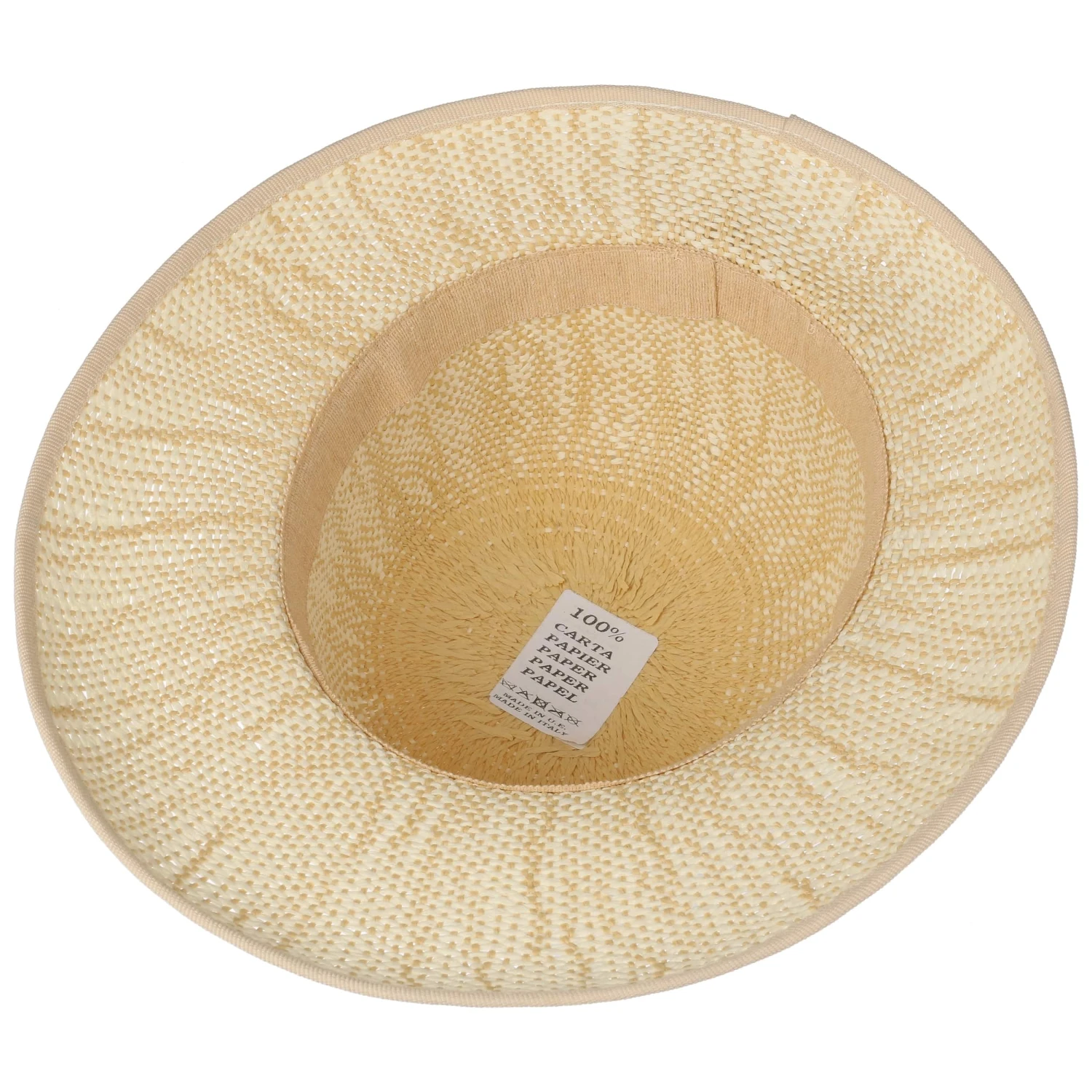 Zarte Drapierungen und eine rückseitige Schleife betonen den sommerlich-unbeschwerten Eindruck. Für zusätzlichen optischen Schwung sorgt die anregende runde Form des Strohhutes. Seine weite Krempe ist frontal deutlich verlängert – für extra viel Schatten.