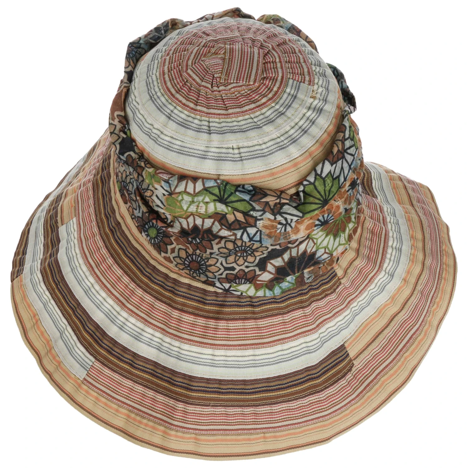 Ein klarer geometrischer Streifenlook ist mit einem romantischen Flowermuster kombiniert. Geradezu verschwenderisch ist die Blütenpracht um die Krone drapiert. Damit passt der vielseitige Glockenhut zu fließenden Sommerkleidern ebenso wie zu legeren Freizeitlooks. Ein Sonnenhut für jeden Tag.